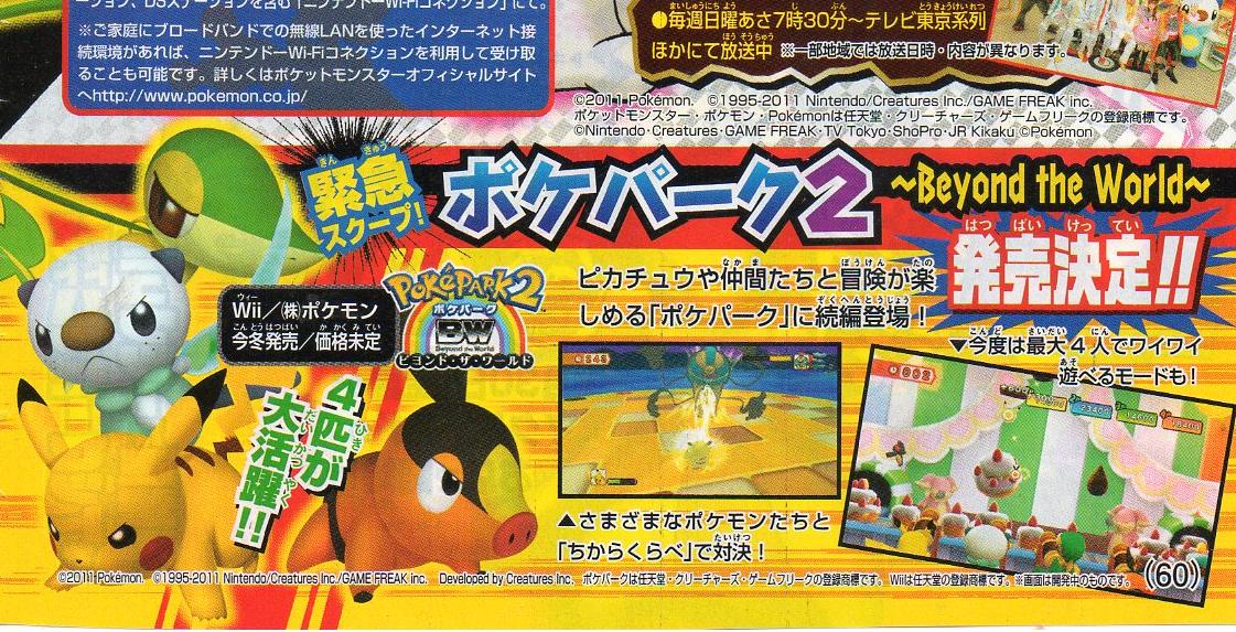 Los primeros detalles de la revista CoroCoro empiezan a llegar y han revelado el juego que ayer domingo ocultaban en Pokémon Smash. Este nuevo juego se llama PokéPark 2: Beyond the World (ポケパーク2 ビヨンド・ザ・ワールド) y es la secuela del juego de Wii PokéPark Wii: La aventura de Pikachu.