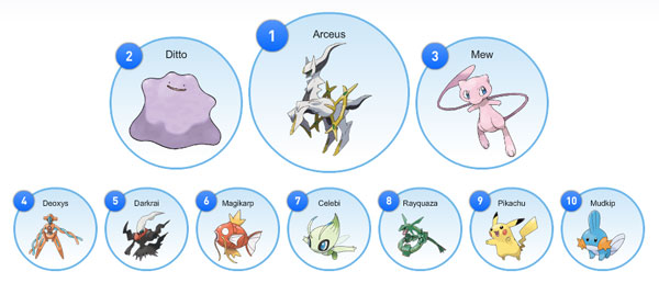 Arceus sigue a la cabeza con el primer puesto, Ditto en el segundo y Mew en el tercero. Lo soprendente de esto es que Magikarp ha conseguido hacerse con el sexto puesto y Mudkip en el decimo. Han quedado afuera del top ten, Shaymin y Jirachi.