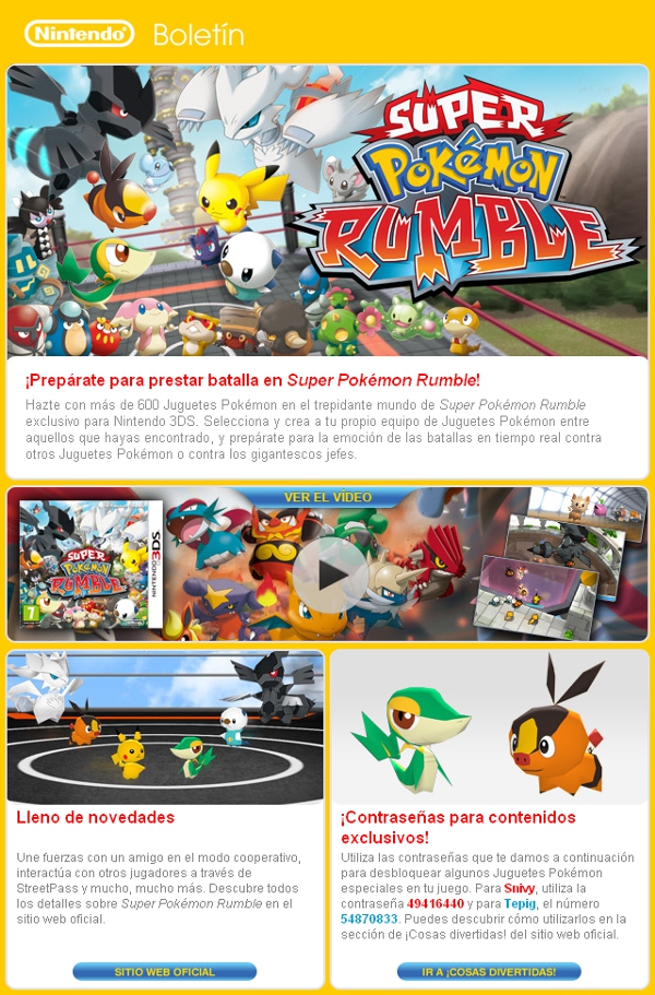 Ya lo dice el boletín: en la web oficial de Super Pokémon Rumble ofrecen la cuarta contraseña, la de Snivy: 4941-6440.