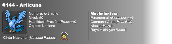 Les paso a contar que tipo de Articuno estaremos regalando. Este Pokémon no es un Pokémon de «evento», sino que es un Pokémon que viene de un juego de la tercera generación Pokémon, más especificamente de Pokémon XD: Tempestad Oscura (Gale of Darkness). El Articuno en cuestión tiene ataques que lo hace especial y además es muy dificil de conseguir ya que viene de un juego de GameCube. Debajo les dejo una plantilla con los detalles de los ataques, nivel, etc. etc.