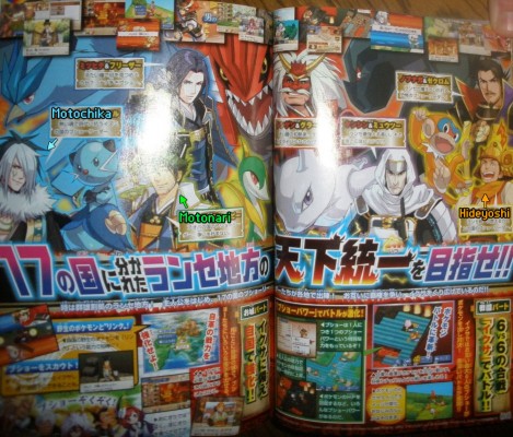 Como mi buen colega ha publicado en la noticia anterior, ya han empezado a circular por internet varios scans de la revista CoroCoro de Enero. Los primeros scans confirman que las batallas que habrá  en Pokémon + Nobunaga’s Ambition son de 6 VS 6, usando 1 Pokémon por entrenador, pero con multiples entrenadores en cada área. Una vez que se derrotan a los lideres de cada uno de los 17 castillos que se encuentran a través de los reinos, se puede tomar el castillo para uno mismo.