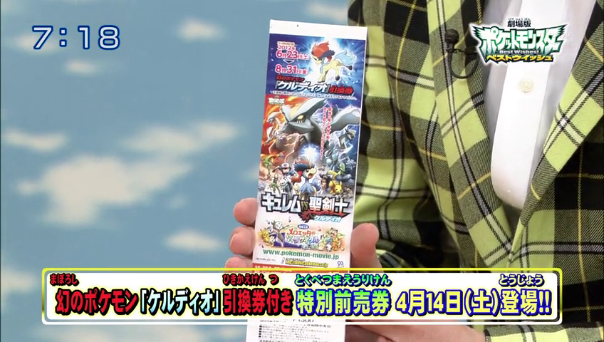En el programa también mostraron los tíckets de dicha película, que se podrán comprar desde el sábado 14 en diversos establecimientos japoneses. Y, cuando se compre, ¡tachán! ¡Un Keldeo te llevarás! Este Keldeo estará al nivel 15 en una Cherish Ball, postará una Cinta Deseo y conocerá los movimientos Acua Jet, Malicioso, Doble Patada y Rayo Burbuja. Su habilidad es Justiciero y como objeto llevará un Máx PP. No se podrá recoger en versiones no japonesas de Pokémon Blanco y Negro y no se podrá intercambiar en el GTS.