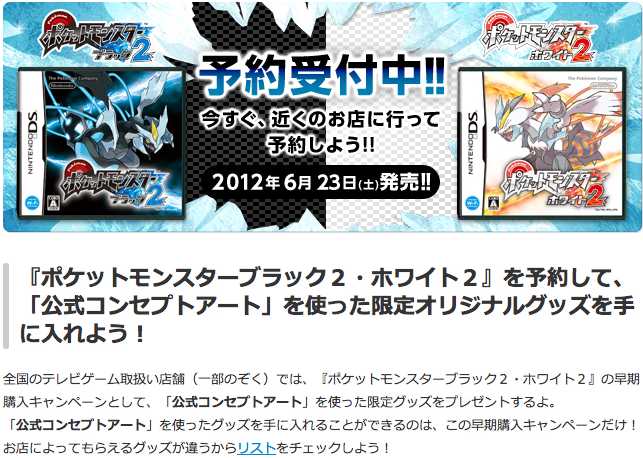 Masuda ha anunciado en su blog la campaña de reserva de Pokémon Edición Blanca 2 y Pokémon Edición Negra 2 en Japón. Cada tienda que participa en esta campaña tendrá su propio merchandising promocional: pegatinas, libretas, etc.
