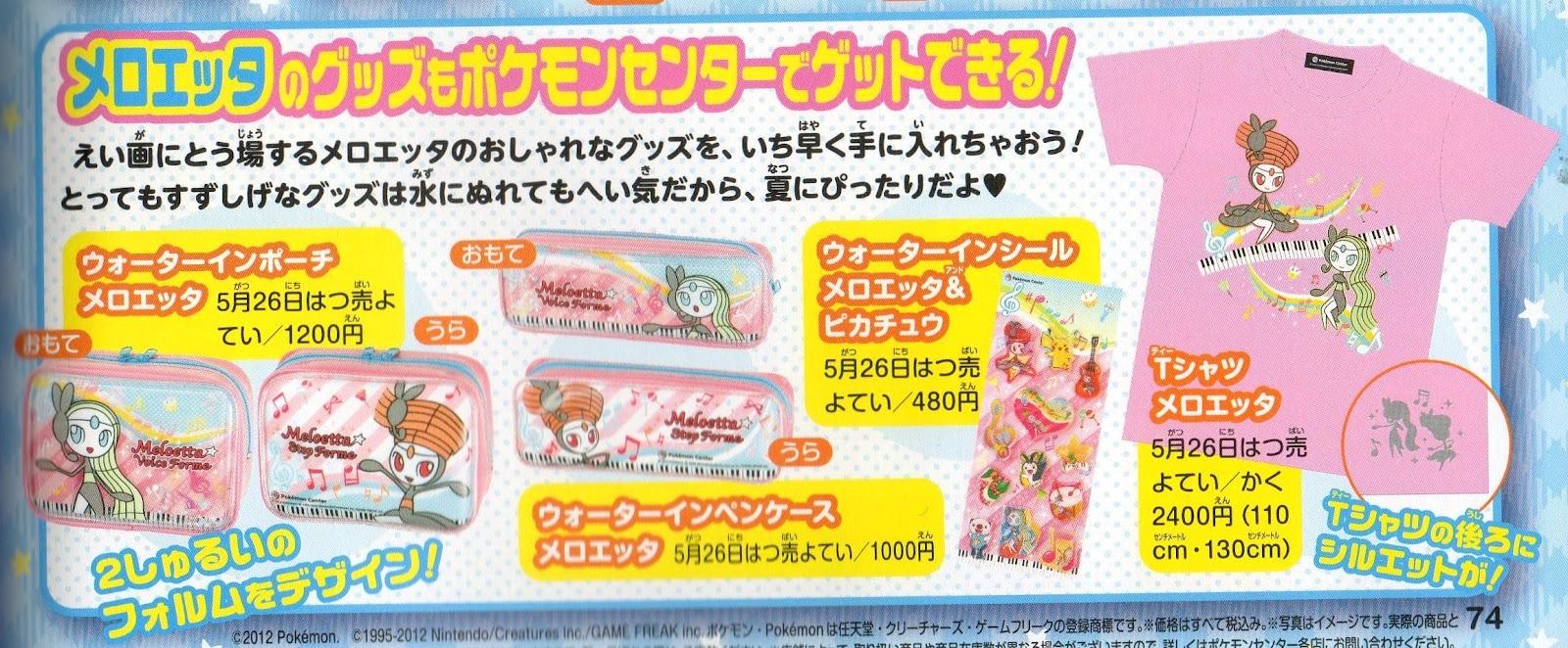 El primer merchandising del último Pokémon revelado, Meloetta, ya está siendo anunciado, concretamente en la revista PokéFan. Nos dice que en el PokéCenJP, desde el 26 de mayo, podremos adquirir: