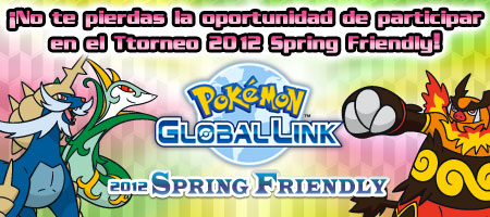 Prepárate para el 2012 Spring Friendly, una nueva competición en línea de Pokémon Global Link.Ya puedes inscribirte en el Torneo 2012 Spring Friendly. Las plazas son limitadas, así que inscríbete lo antes posible. El periodo de registro termina oficialmente el miércoles 9 de mayo a las 11:59 p. m. UTC, a no ser que se alcance el cupo de participantes antes. El Torneo comienza a las 12:00 a. m. UTC del jueves 10 de mayo. ¡Tendrás hasta las 11:59 p. m. UTC del lunes 14 de mayo para ganar todos los combates que puedas!