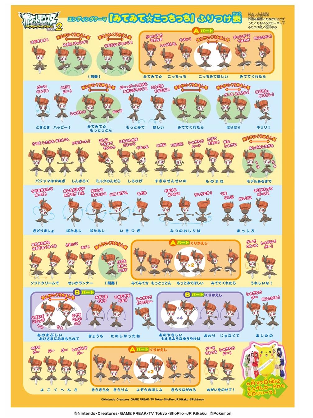 Aquí tenéis el ending, la versión del baile de Meloetta y los pasos que sigue (clic para ampliar). ¿Te atreves? Lo canta Momoico Clover Z (también conocido como MomoClo (ももクロ)) y la canción se llama MiteMite ☆ KoChiChi.