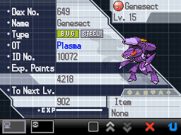 ¡El Pokémon singular Genesect! Tecno Shock (Techno Blast), su movimiento exclusivo, puede cambiar de tipo. Genesect se encuentra en Nv. 15, sus movimientos son; Tecno Shock (Techno Blast), Bomba Imán (Magnet Bomb), Rayo Solar (Solarbeam) y Doble Rayo (Signal Beam). La habilidad que tiene es Descarga (Download), adapta su fuerza para cada rival. También lleva una Cinta Clásica (Classic Ribbon).
