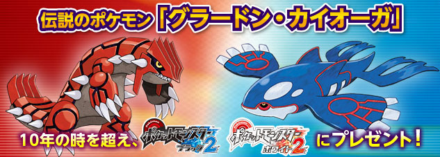 En las tiendas Centro Pokémon y Toys ‘R’ Us de todo Japón estarán repartiendo eventos de Kyogre y Groudon para conmemorar los 10 años de aniversario de Pokémon Rubí y Zafiro. Repartirán a Groudon a los que tengan el juego de Pokémon Negro 2 y Kyogre a los que lleven Pokémon Blanco 2. No se saben más detalles sobre estos eventos pero si la fecha, que será del 21 de Noviembre del 2012 hasta el 10 de Enero del 2013.