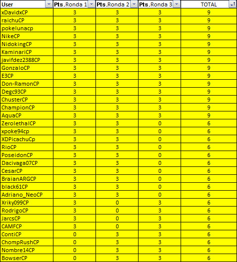 El torneo finalizó hoy con 32 participantes que superaron las etapas y pasaron a las eliminatorias directas. Debajo les dejo el listado de usuarios que se han clasificado y sus puntajes.