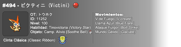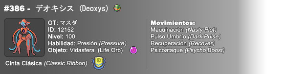 Este Domingo 13 de Enero estaremos repartiendo dos pokémon para cada participante inscrito, los cuales serán Masuda Deoxys y Tohoku Victini, ambos eventos provienen de unos eventos presenciales de Japón durante el mes de Diciembre y Enero. Son para Black & White 1 y 2 (en español o en inglés)