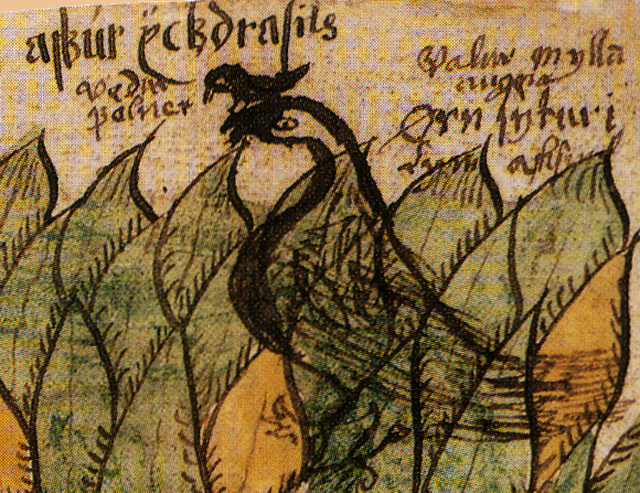 Dibujo Poético Nórdico del Dragón mordiendo las raíces de Yggdrasil.
