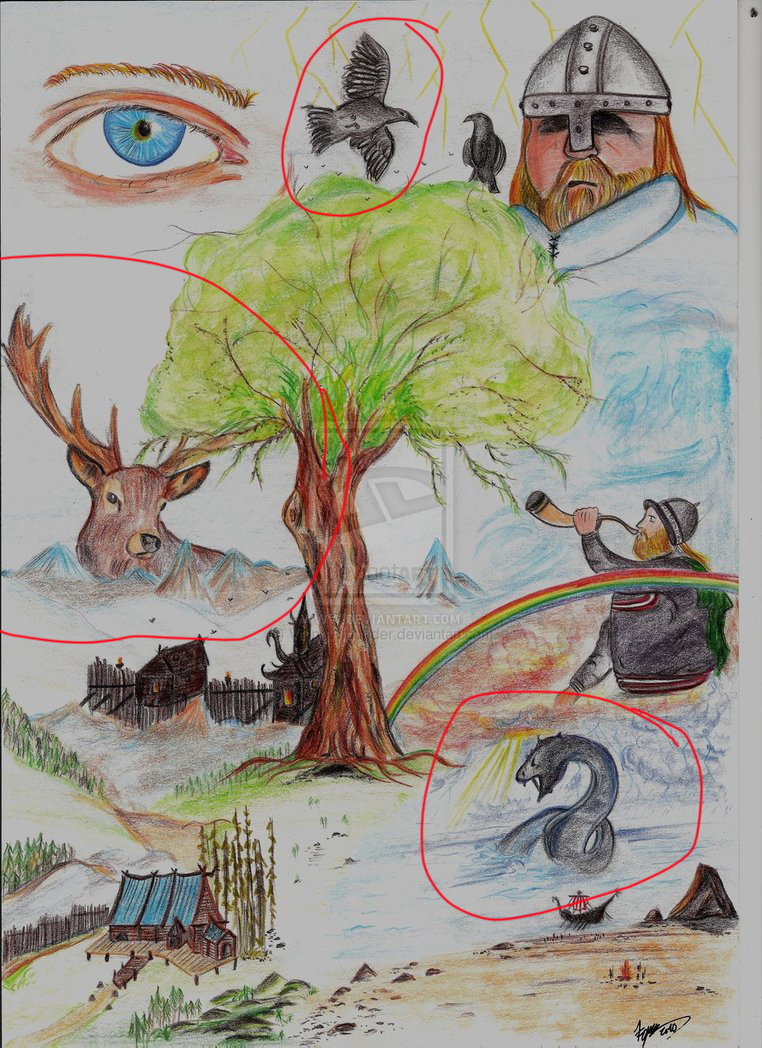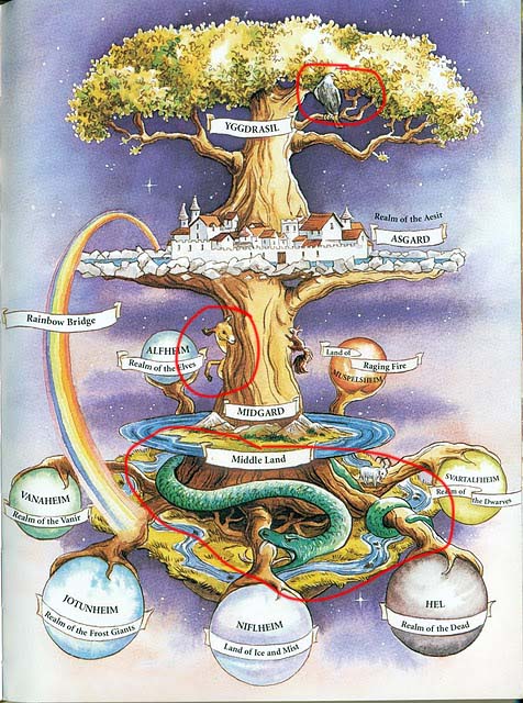 Representación artística de Yggdrasil con el águila, el ciervo y el dragón presentes en sus respectivas ubicaciones.