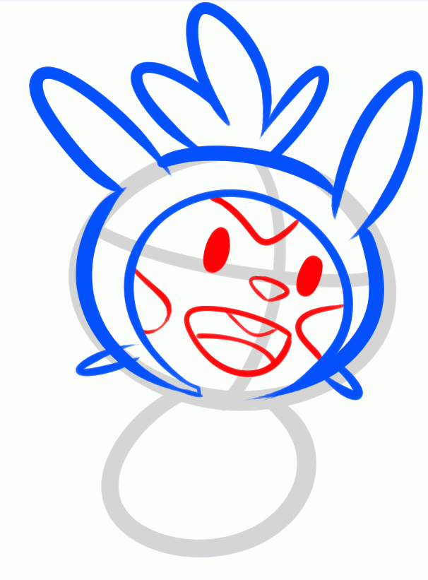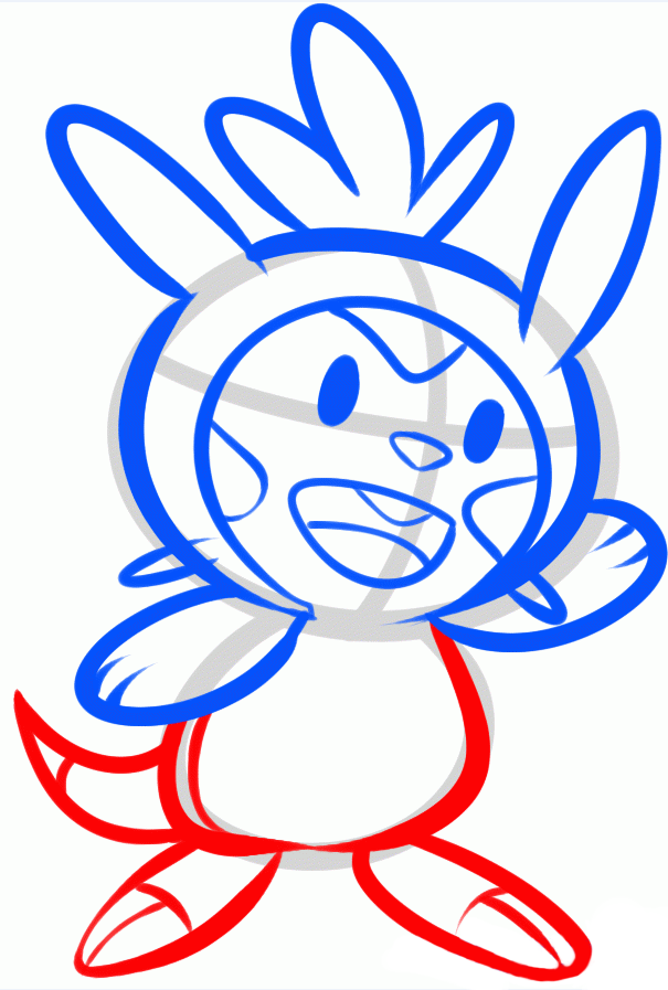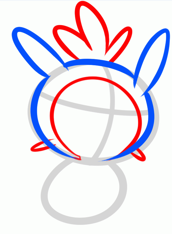 PASO 3: A continuación, dibuja la capucha interior de la cabeza de Chespin para enmarcar la cara. Dibuja el mechón arriba de la cabeza y luego unos picos a los lados de la cabeza.