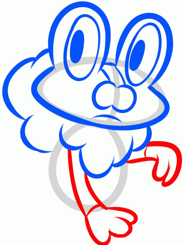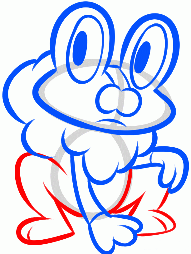 PASO 6: Por último, dibuja el resto del cuerpo incluyendo las piernas y los pies. Como puedes ver, Froakie esta posando sentado como un sapo. Borra todas las guías innecesarias del dibujo.