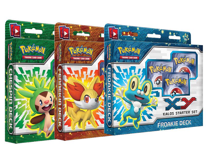 Los protagonistas, como no podría ser de otra forma, son los tres Pokémon iniciales de la región de Kalos: Chespin, Fennekin y Froakie. Cada set inicial, además de un mazo de 60 cartas, vendrá con un sobre de cartas de las series Blanco y Negro.