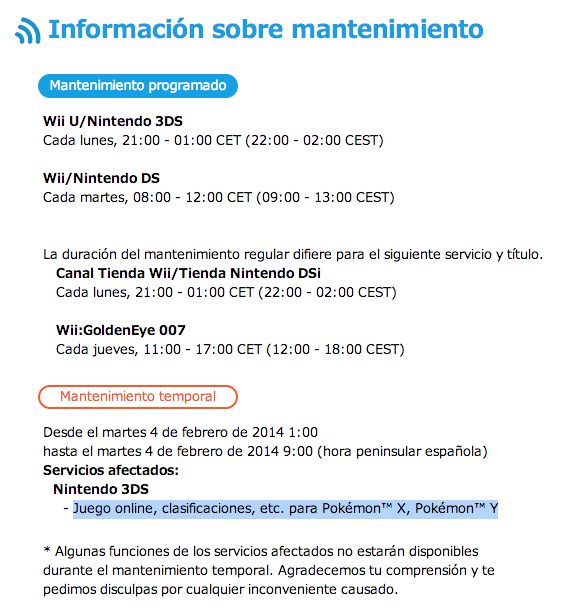 Nintendo ha anunciado en su página de estado de su red que el martes 4 de febrero, de 01h a 09h hora española (ver otros países), el servicio dedicado al juego online, a las clasificaciones, etc. estará fuera de servicio. El mantenimiento no debería alargarse más allá de esas 8h.