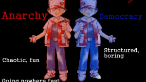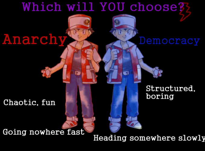 Desde el primer momento no había un sistema llamado anarquía como tal, sino que simplemente se lanzaba un comando y lo ejecutaba. Tras estar más de 24h en la Guarida Rocket sin poder salir, el dueño del canal implementó la democracia: la opción más elegida en un período de 20 segundos se realiza.