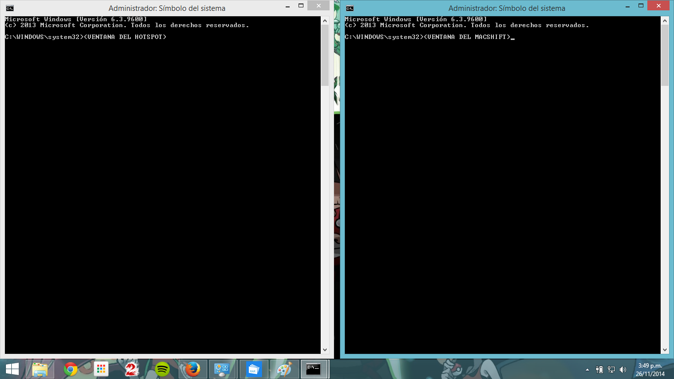 Una vez hecho esto tendremos dos ventanas abiertas. Para mayor comodidad acomodaremos una a la izquierda y otra a la derecha, arrastrando las ventanas a los bordes, para que finalmente quede acá. A la ventana de la izquierda le vamos a llamar la ventana del hotspot y a la de la derecha la ventana del macshift.