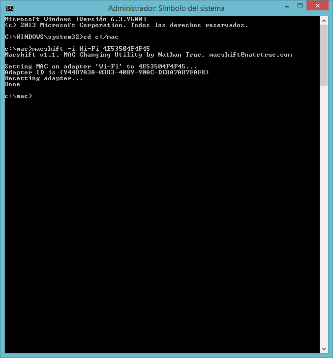 Ahora si, ya teniendo nuestra MAC (que en este caso vamos a usar 4E:53:50:4F:4F:45) vamos a quitarle cualquier guión o dos puntos que tenga, para que quede algo así: 4E53504F4F45. A continuación ejecutaremos el siguiente comando en la ventana de macshift: