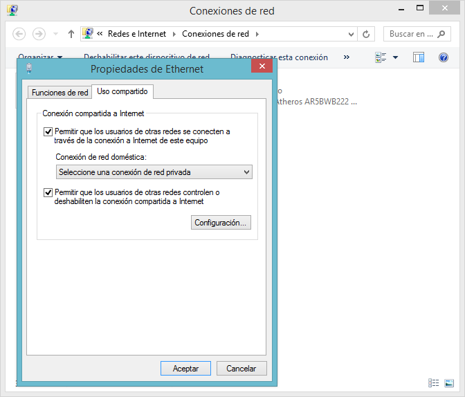A continuación nos iremos a la pestaña de Compartir, seleccionaremos los dos checks y muy importante; donde dice Seleccione una conexión de red privada daremos clic y seleccionaremos la nueva red que acabamos de crear, no hay que seleccionar Wi-Fi, lo que debemos seleccionar es la nueva red que hace poco apareció, puede llamarse Hosted Network, o algo así.