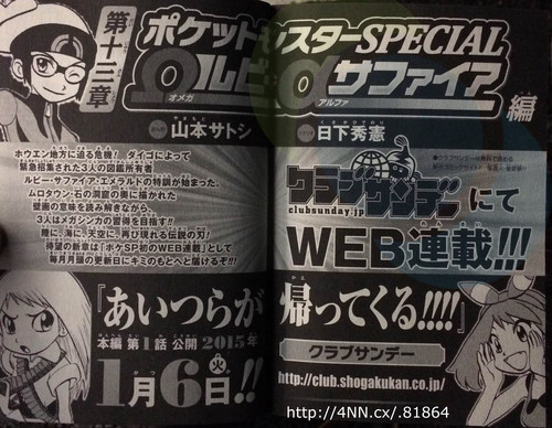 Se ha anunciado que el manga de Satoshi Yamamoto y Hidenori Kusakabe, Pocket Monsters Special o mejor conocido como Pokémon Adventures, empezará el arco Omega Ruby & Alpha Sapphire a partir del próximo 6 de enero en el sitio web de manga digital Web Sunday.