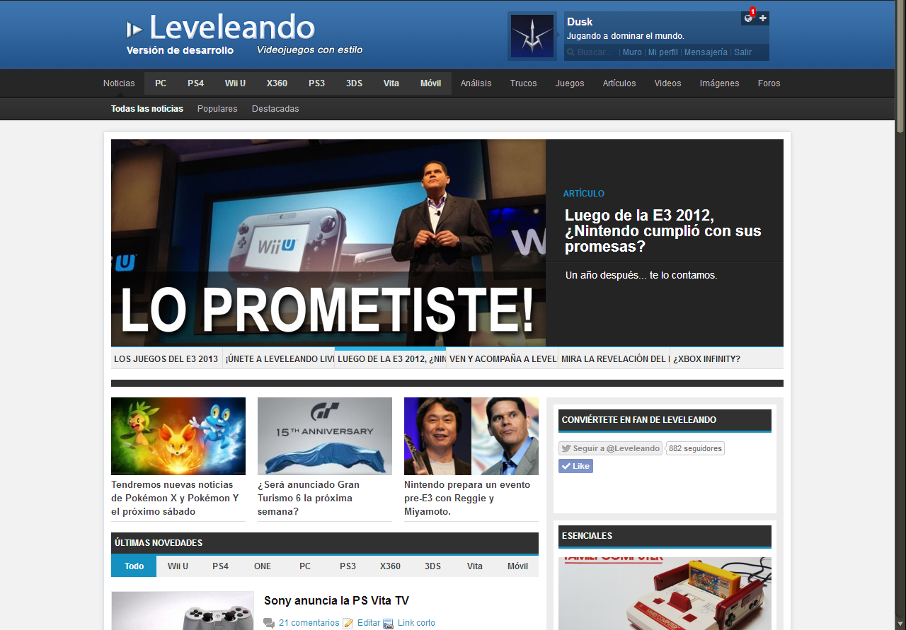 Poco a poco Leveleando se fue modificando y se introdujeron las versiones 3.1, 3.2, 3.3, 3.4 y otras más. Pueden repasar toda la historia de Leveleando a través de este enlace del Web Archive y también en este PDF que hicimos hace unos años para recopilar la historia del mismo. El gran slider de contenido del actual Centro Pokémon y las pestañas de noticias, artículos, cómics, etc han sido tomadas directamente desde Leveleando y simplemente estilizadas para el nuevo Centro Pokémon. De hecho en la captura del E3 que está más arriba el código base del slider es exactamente el mismo, solo que con cambios de estilo (CSS).