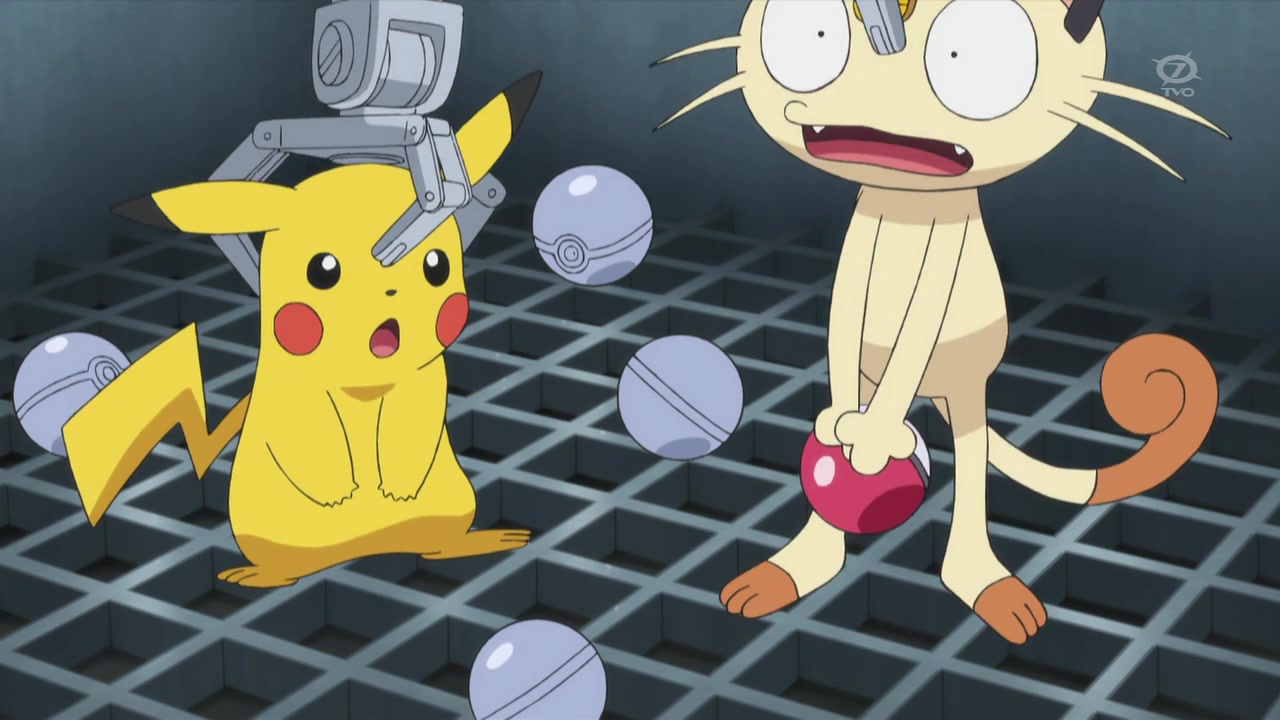 Ash y sus amigos quedan atrapados en una fábrica de Poké Balls, mientras el Equipo Rocket roba sus Pokémon, y Meowth persigue a Pikachu.