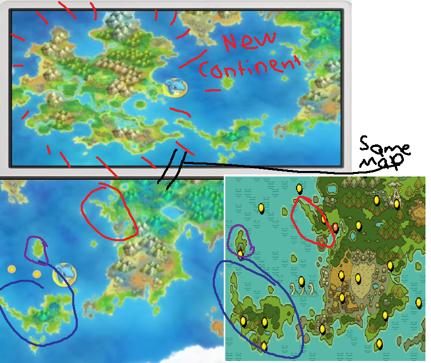 Pero quizás lo más curioso es que parece que los continentes estarán basados en los mapas de anteriores entregas de la saga. Ya que algunos fans notaron que uno de los continentes de Pokémon Super Mystery Dungeon es prácticamente igual al de Equipo de Rescate Rojo / Azul.
