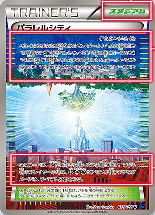 El blog oficial de TCG y la cuenta de Twitter en japonés oficial de Pokémon revelaron varias cartas nuevas que conformarán el set de XY8‘Blue Impact’ / ‘Red Flash’. Hasta ahora, además de la nueva mecánica BREAK, también se añaden las cartas de Estadio con efecto doble, siendo la primera Ciudad Paralela (Parallel City), la cual tiene dos efectos diferentes, uno en la parte superior y otro en la parte inferior.