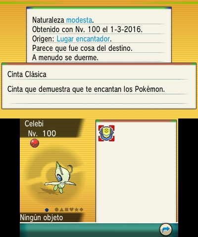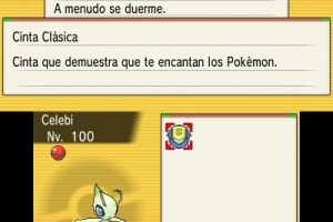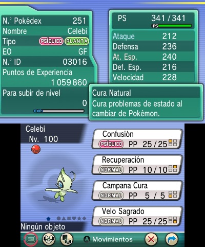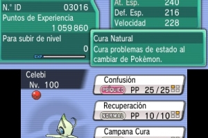 El Celebi está a nivel 100 y conoce los movimientos Confusión (Confusion), Recuperación (Recover), Campana Cura (Heal Bell) y Velo Sagrado (Safeguard).