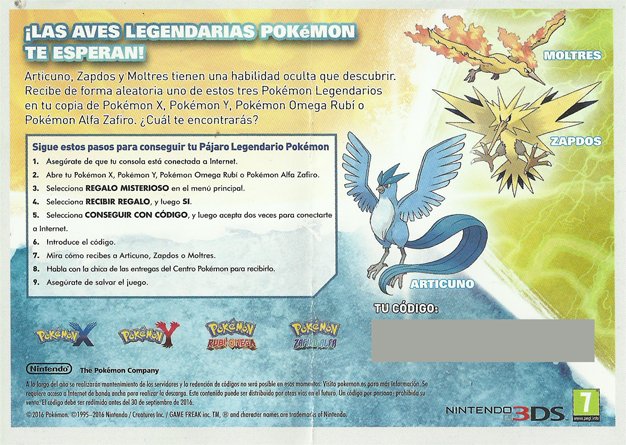 Los tres Pájaros Legendarios, Articuno, Zapdos y Moltres, llegan con sus habilidades ocultas, gracias a un código que se puede obtener en la Revista Nintendo y en los hipermercados Carrefour. Se apunta a que otras superficies, como Game o El Corte Inglés, puedan ofrecerlo también. Cualquier juego de la VI Gen de Pokémon es válido para obtenerlos: X, Y, Rubí Omega y Zafiro Alfa.