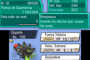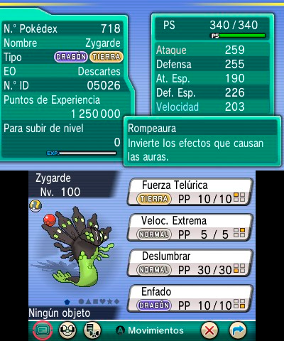 Este Zygarde está a nivel 100 y conoce los movimientos Fuerza Telúrica (Land’s Wrath), Velocidad extrema (Extremespeed), Deslumbrar (Glare) y Enfado (Outrage).