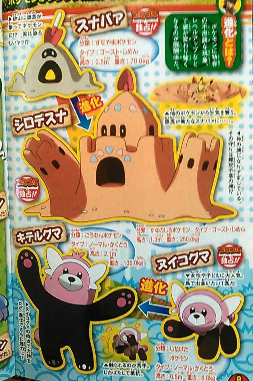 Primero hay dos nuevos Pokémon basados en castillos de arena, el pequeño se llama Sunabā y el grande Shirodesuna; ambos son tipo Fantasma / Tierra. La prevolución de Bewear se llama Nuikoguma y es tipo Normal / Lucha.