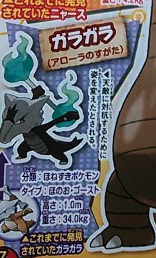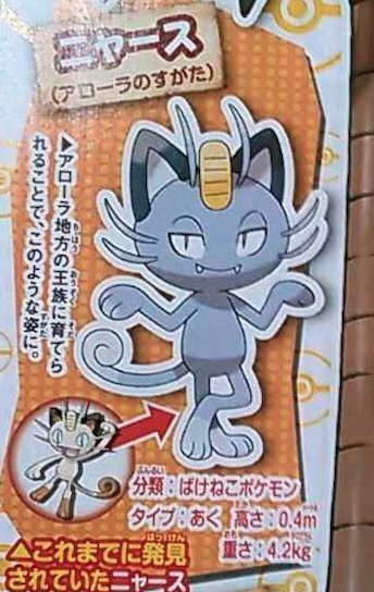 Junto con esto, también se han revelado dos nuevos Pokémon de Alola. El Mewoth de Alola seŕa tipo Siniestro, mientras que el Marowak de Alola será tipo Fuego / Fantasma. El Meowth de Alola surgió después de ser criado por la familia real de Alola, mientras que el Marowak de Alola surgió ante la necesidad de defenderse de sus depredadores naturales.