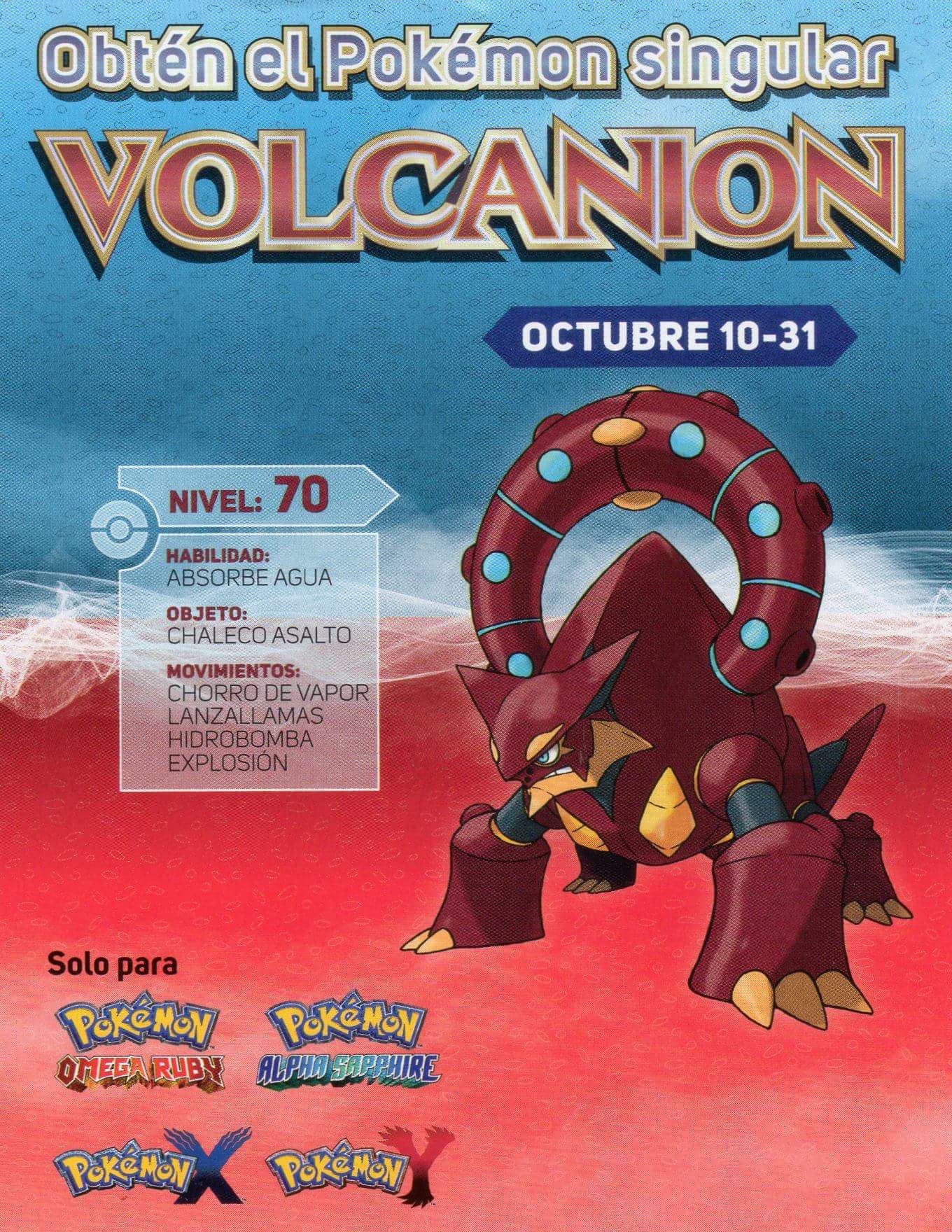 Pueden obtener a Volcanion en su juego de Pokémon X, Y, Rubí Omega o Zafiro Alfa, y para ello solo deben visitar alguna de estas tiendas e ir a pedir el código. No es necesario comprar otra cosa o realizar preventa de otro juego.