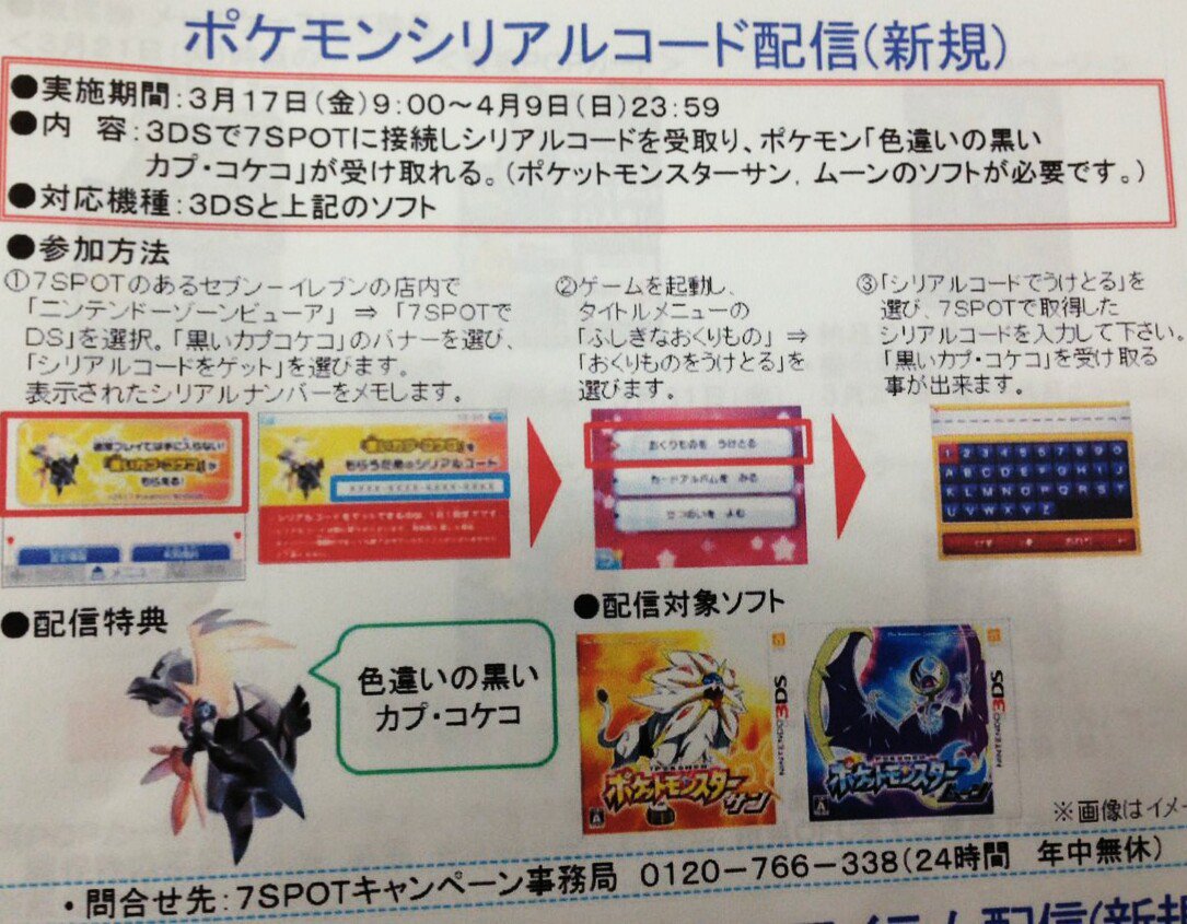 Por el momento este evento será exclusivo de Japón y se repartirán códigos para obtener al Pokémon en tiendas 7SPOT. El evento iniciará el 17 de marzo y terminará el 9 de abril.