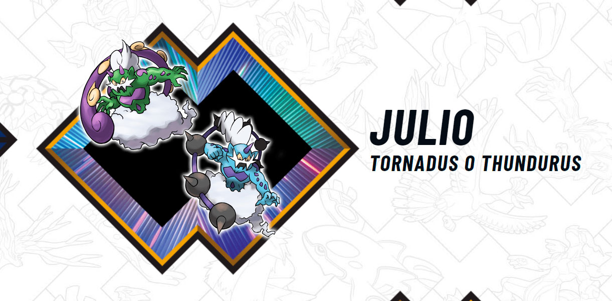 • Julio: Tornadus, Pokémon legendario de tipo Volador, o Thundurus, Pokémon legendario de tipo Eléctrico y Volador, de la región de Teselia.