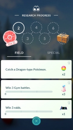 Existen dos tipos de investigaciones, las tareas de investigación de campo que se realizan girando Poképaradas para obtener objetivos como derrotar cierto Pokémon, combiatiendo etc. y las tareas de investigación especiales que son peticiones especiales del Profesor Willow.