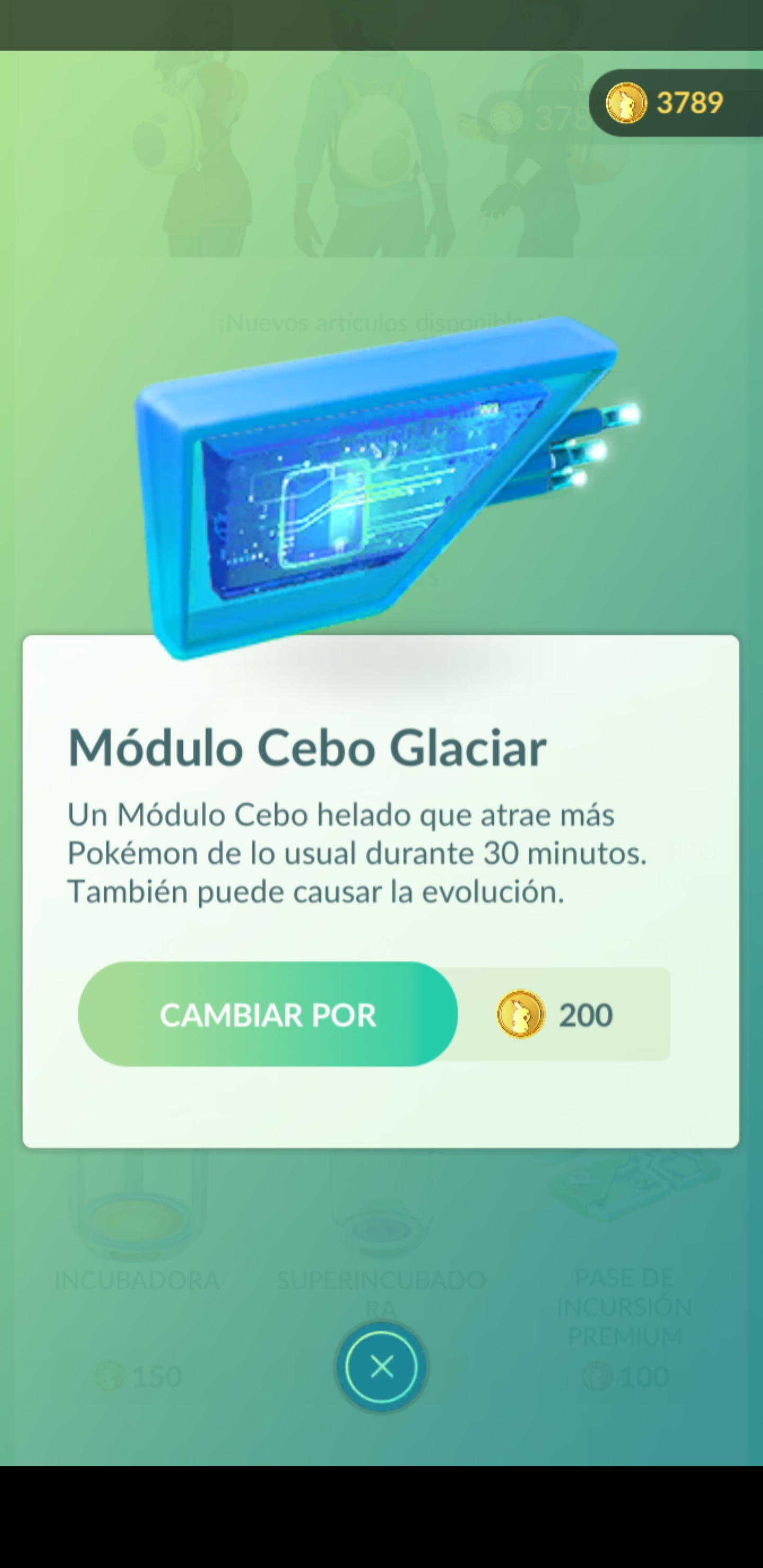 - Glacial Lure Module (Módulo Cebo Glaciar) – Un Módulo Cebo helado que atrae Pokémon por 30 minutos, especialmente a aquellos que aman el frío. También puede hacer evolucionar a ciertos Pokémon (Eevee en Glaceon). Cuesta 200 Pokémonedas.
