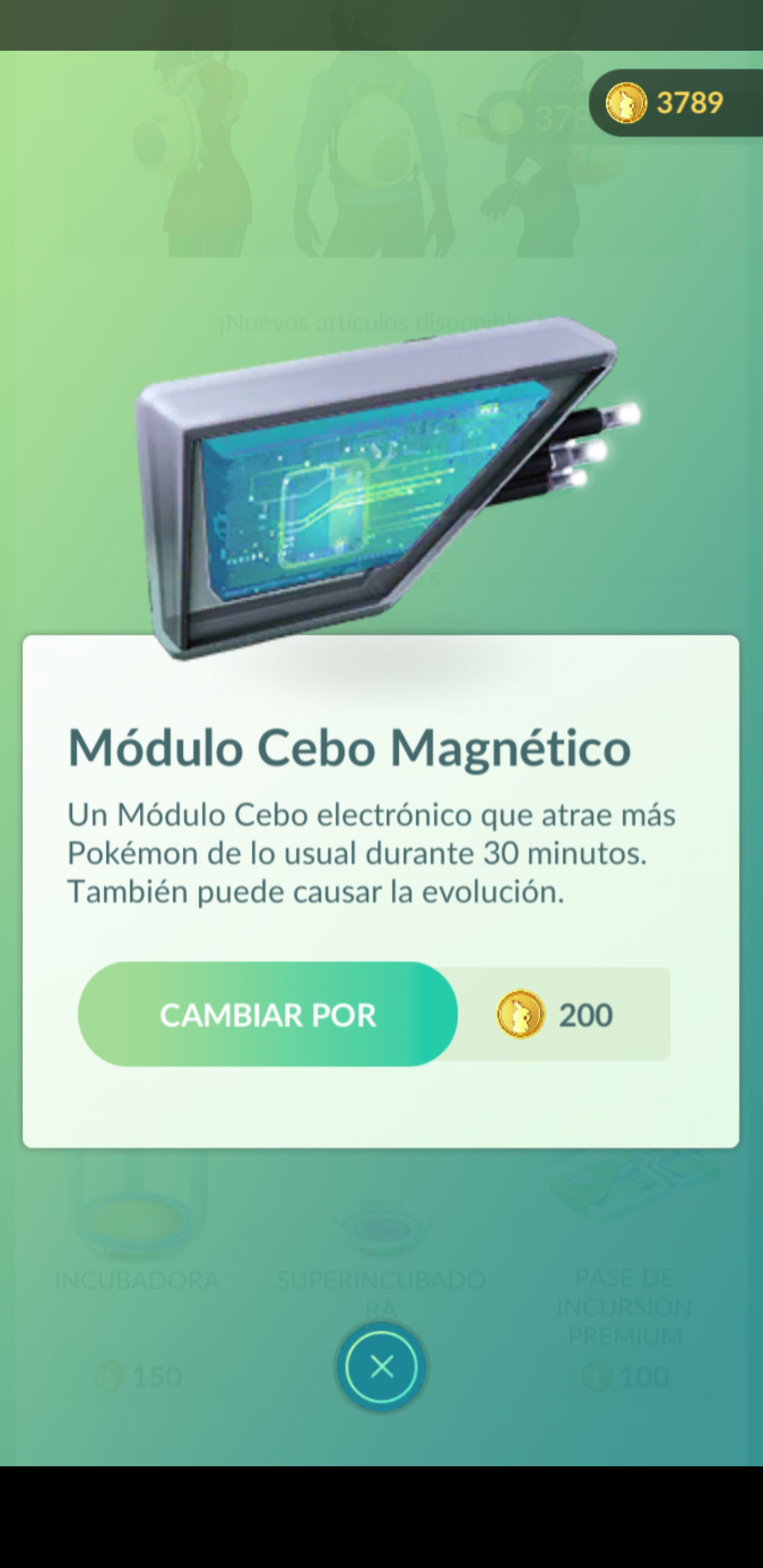 - Magnetic Lure Module (Módulo Cebo Magnético) – Un Módulo Cebo electrónico que atrae Pokémon por 30 minutos, especialmente a aquellos que poseen un campo magnético. Cuesta 200 Pokémonedas.
