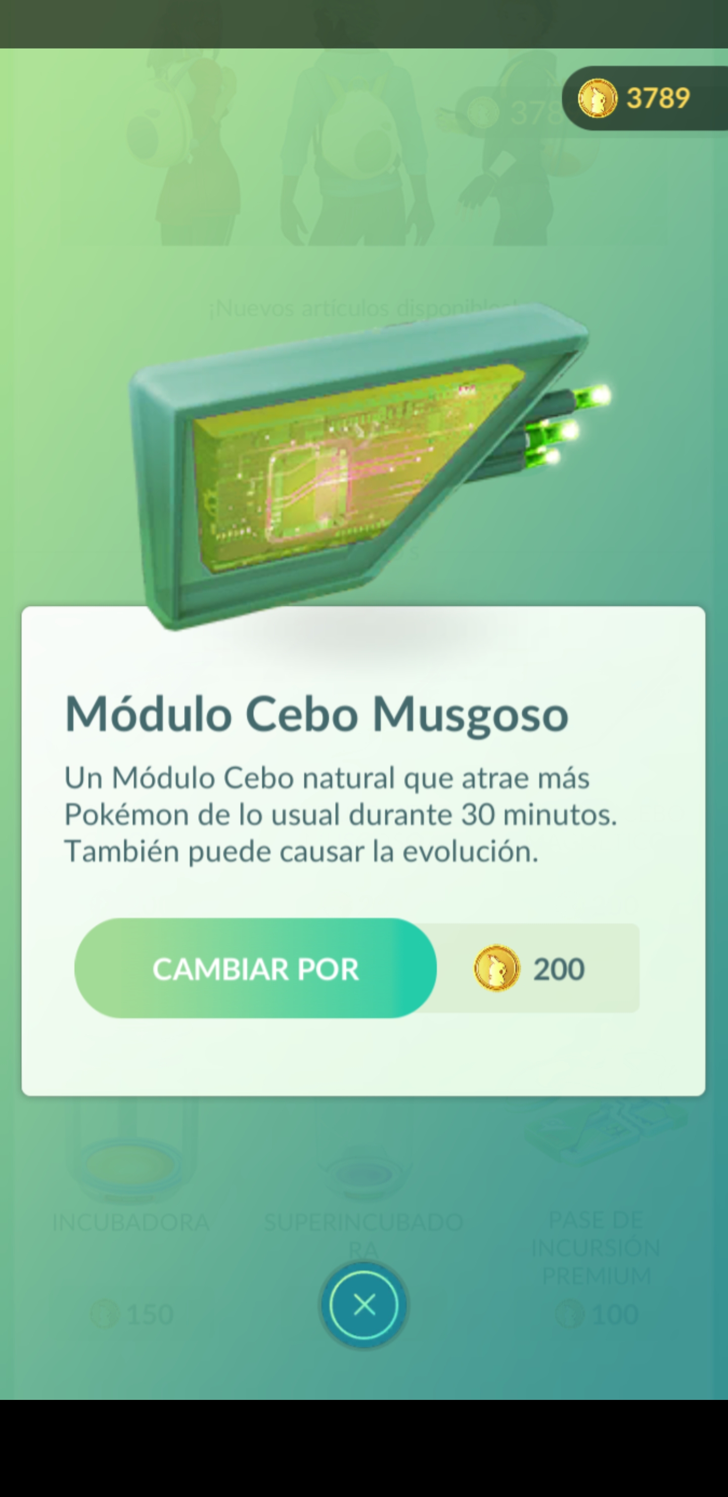 - Mossy Lure Module (Módulo Cebo Musgoso) – Un Módulo Cebo natural que atrae Pokémon por 30 minutos, especialmente a los que aman el aroma a musgo. Cuesta 200 Pokémonedas.