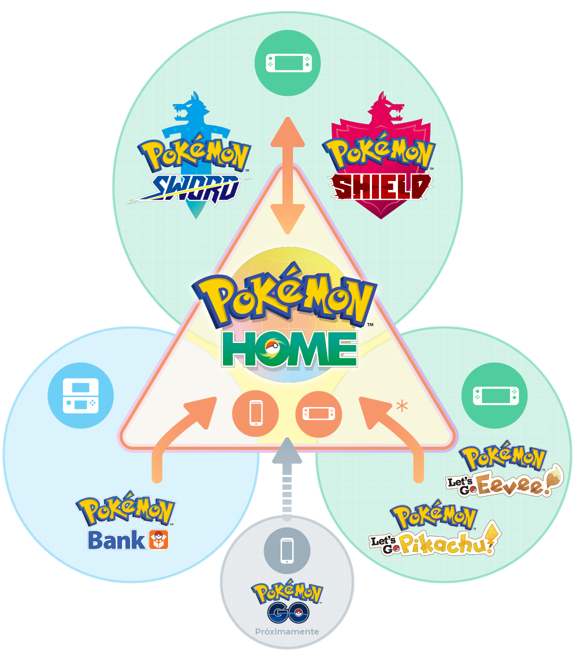 Pokémon HOME, diseñado como un lugar de reunión para todos los Pokémon, permitirá a los Entrenadores traer a sus Pokémon desde los juegos de la serie principal que estén conectados y guardarlos en cajas en la nube o transferirlos entre los juegos compatibles. Además, los fans podrán acceder a las mismas cajas si vinculan la misma cuenta Nintendo a las versiones para Nintendo Switch y para dispositivos móviles. La versión de Pokémon HOME para Nintendo Switch puede conectarse con los videojuegos Pokémon Espada, Pokémon Escudo, Pokémon: Let’s Go, Pikachu! y Pokémon: Let’s Go, Eevee!. Ambas versiones pueden conectarse con el Banco de Pokémon para Nintendo 3DS. La conexión con Pokémon GO está en desarrollo.