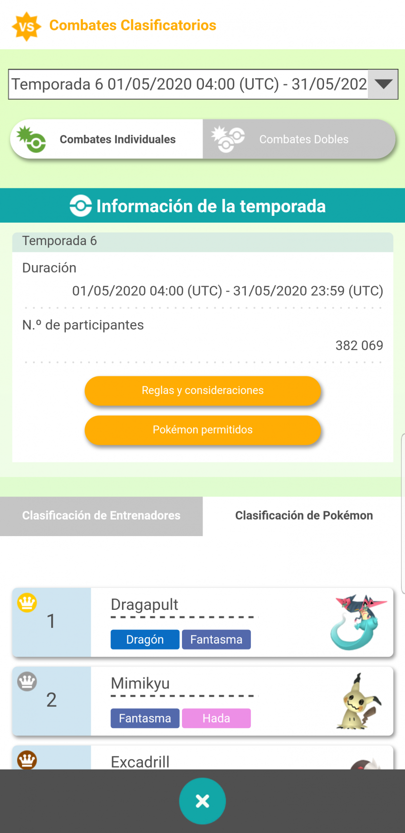 - En Combates Clasificatorios podrás ver los datos de las distintas temporadas del competitivo, incluyendo reglas, Pokémon permitidos, top de entrenadores y top de Pokémon más usados.