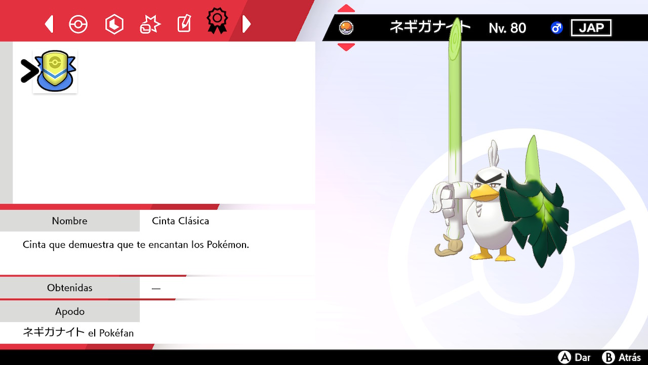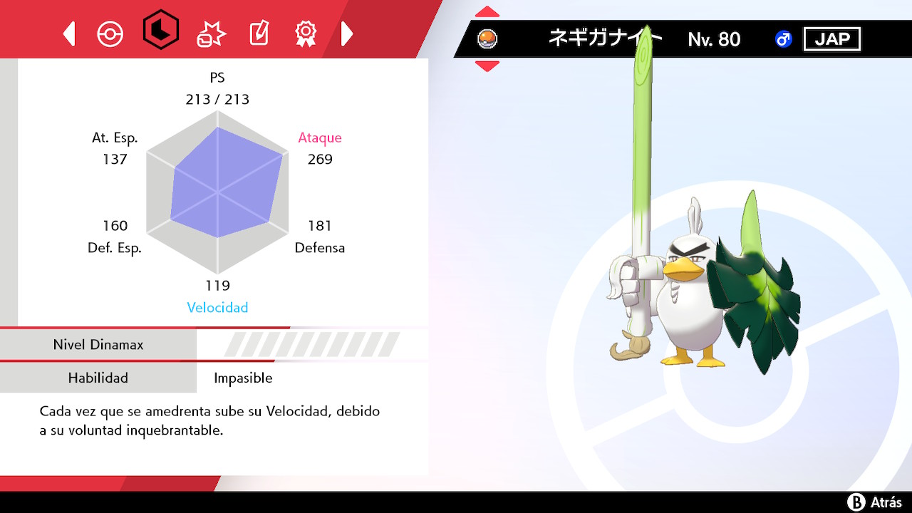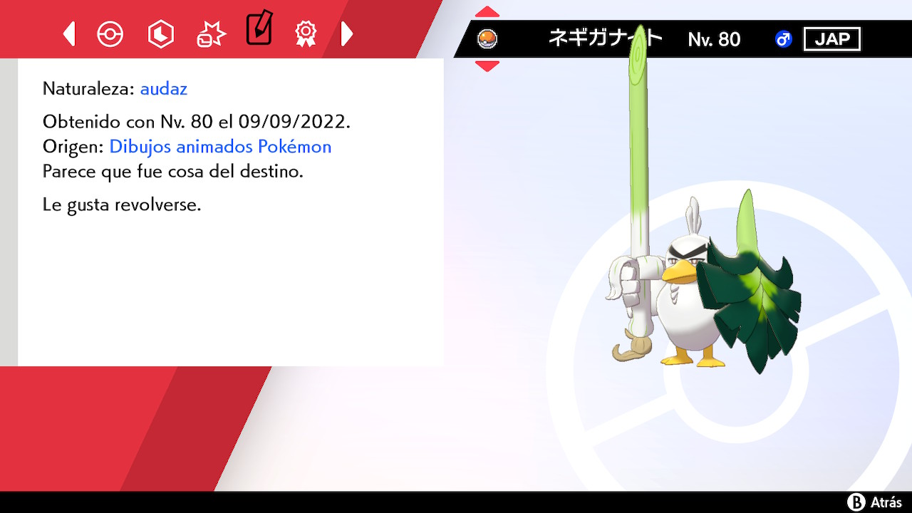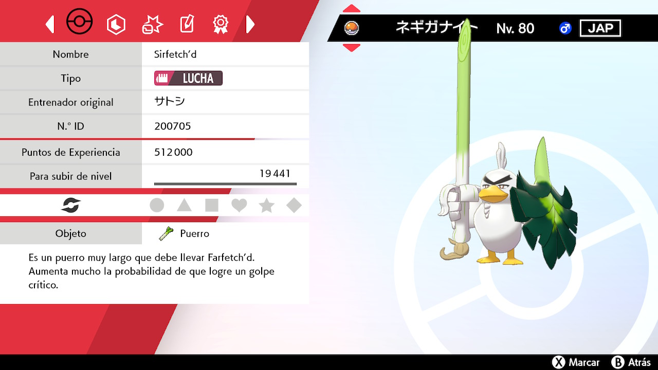 Sirfetch’d se encuentra en Nv. 80 y su origen es «Dibujos animados Pokémon». Viene con el objeto Puerro y la Cinta Clásica. Su habilidad es Impasible.