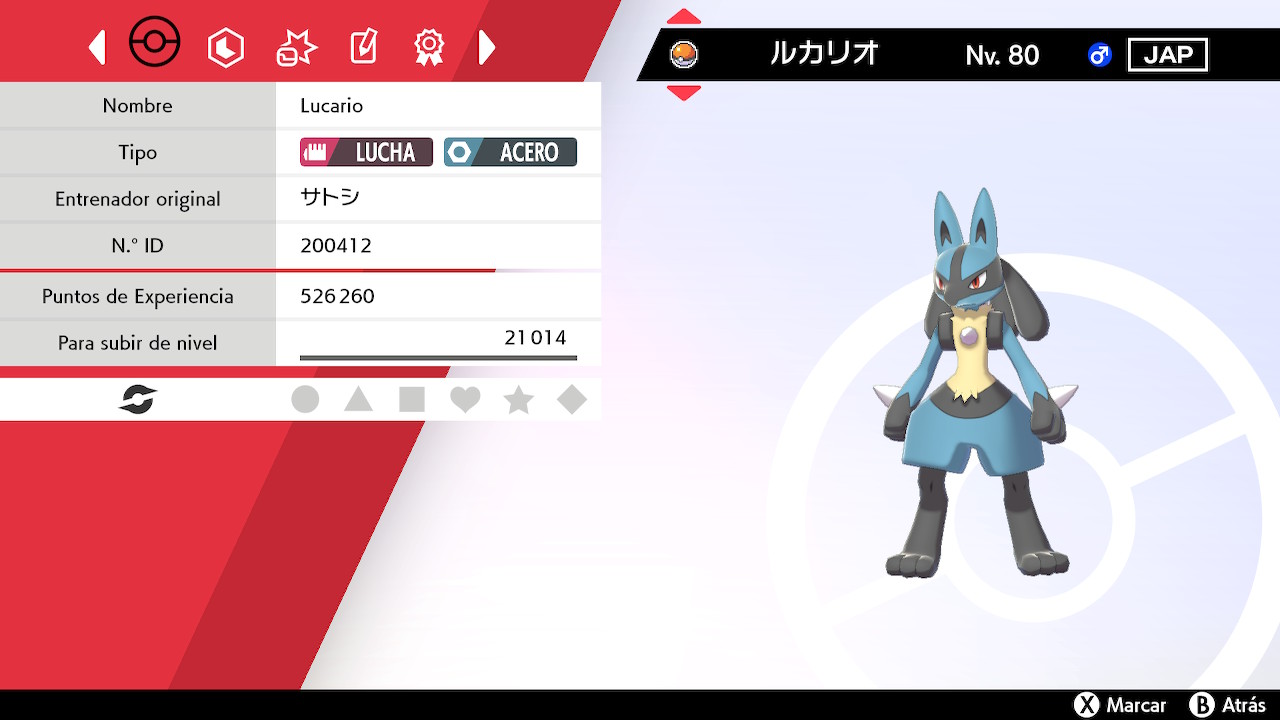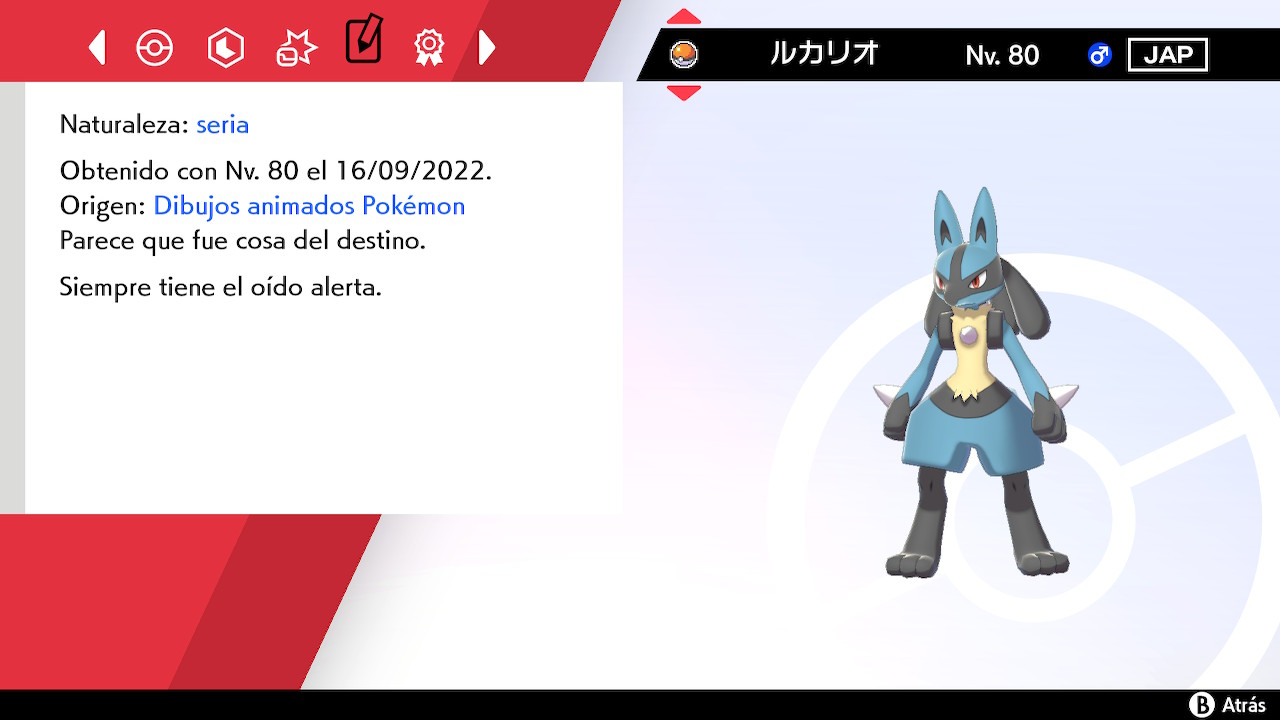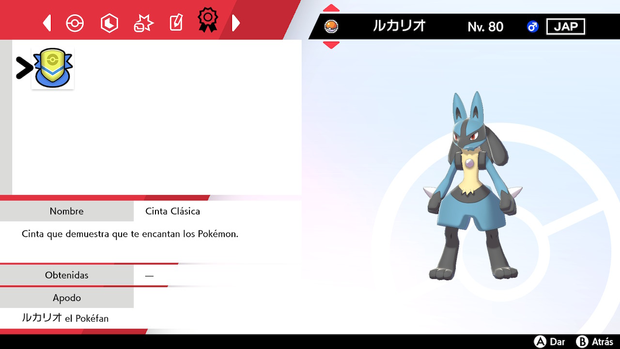 Lucario se encuentra en Nv. 80 y su origen es «Dibujos animados Pokémon». Viene con la Cinta Clásica y su habilidad es Foco Interno.