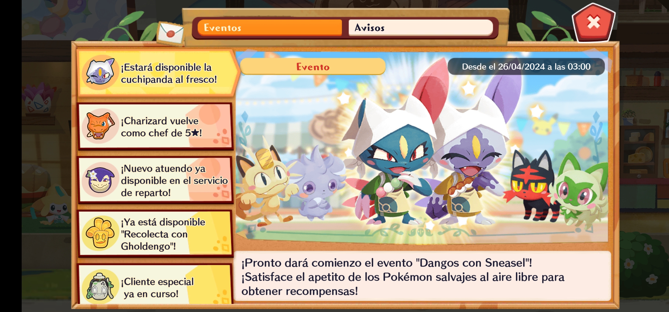Un nuevo evento ha sido anunciado para Pokémon Café ReMix. Se trata de Dangos con Sneasel, que estará disponible a partir del 26 de abril de 2024 a las 03:00 (GMT-3).