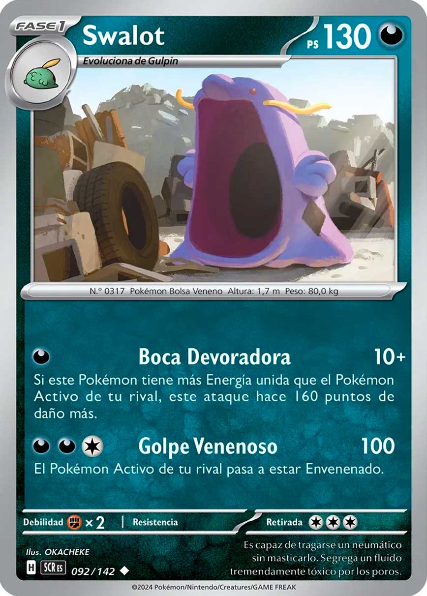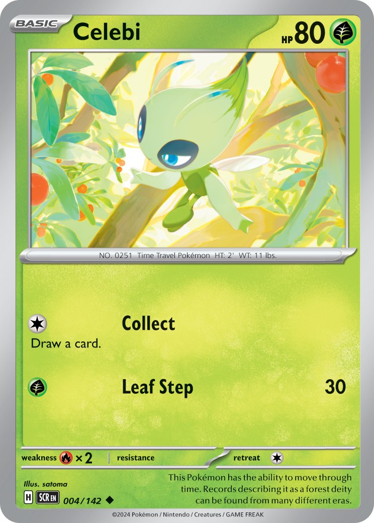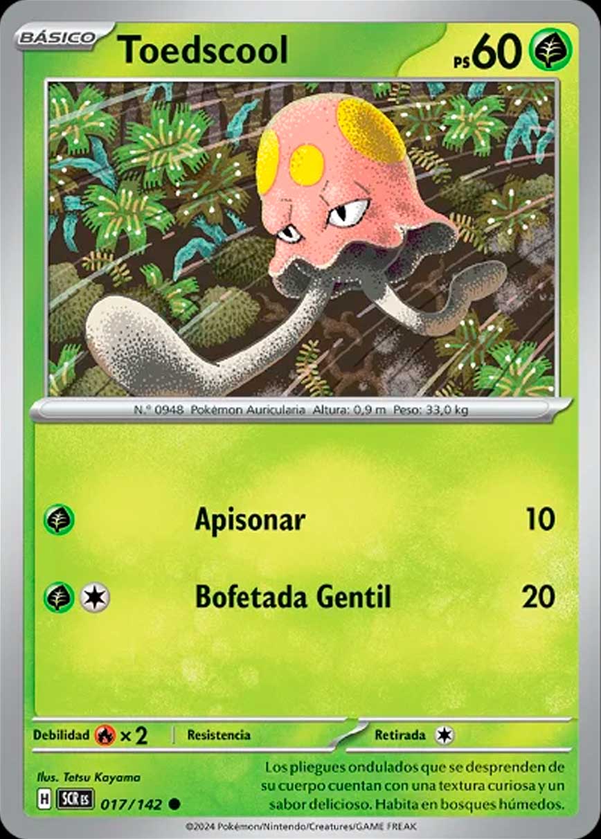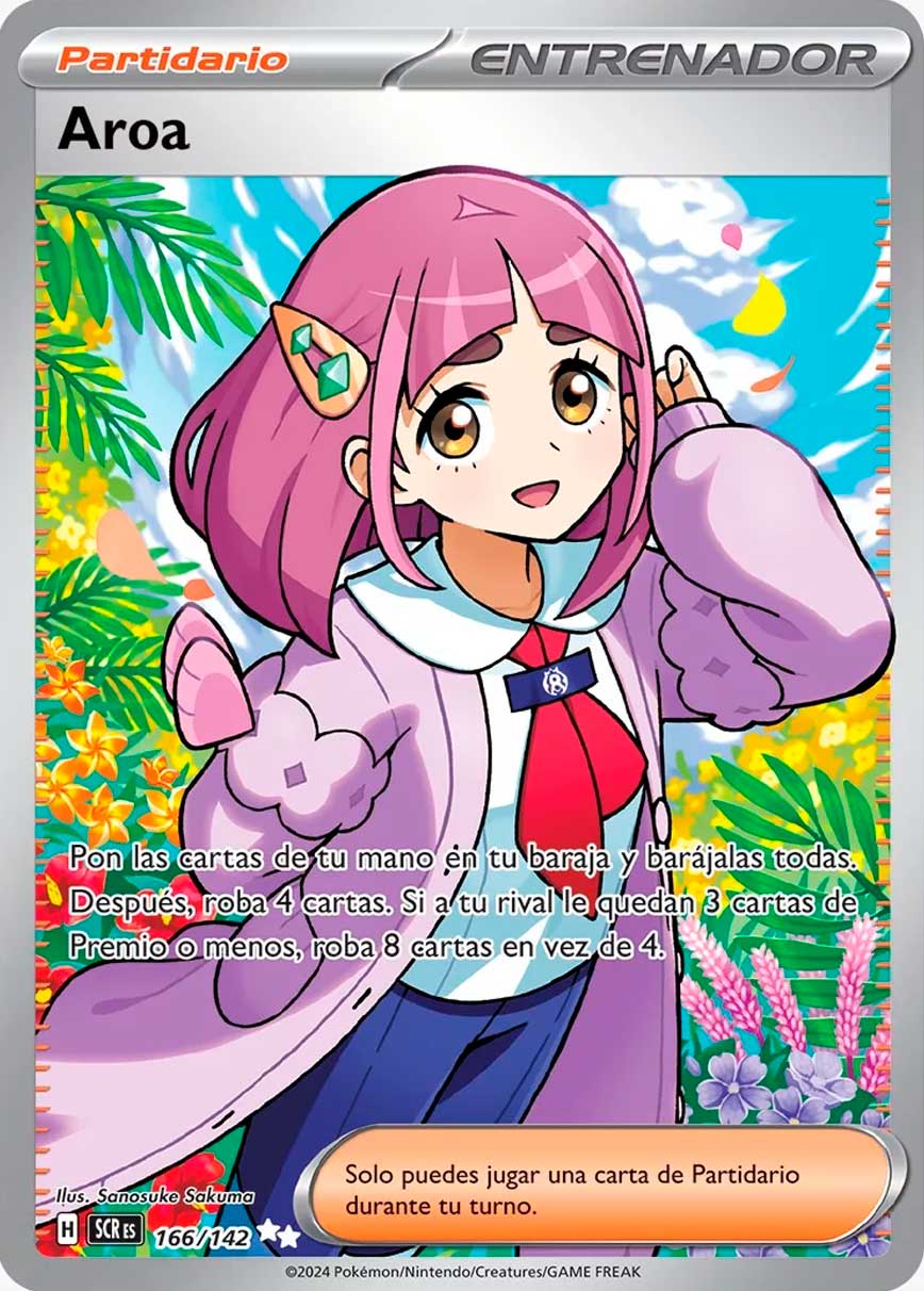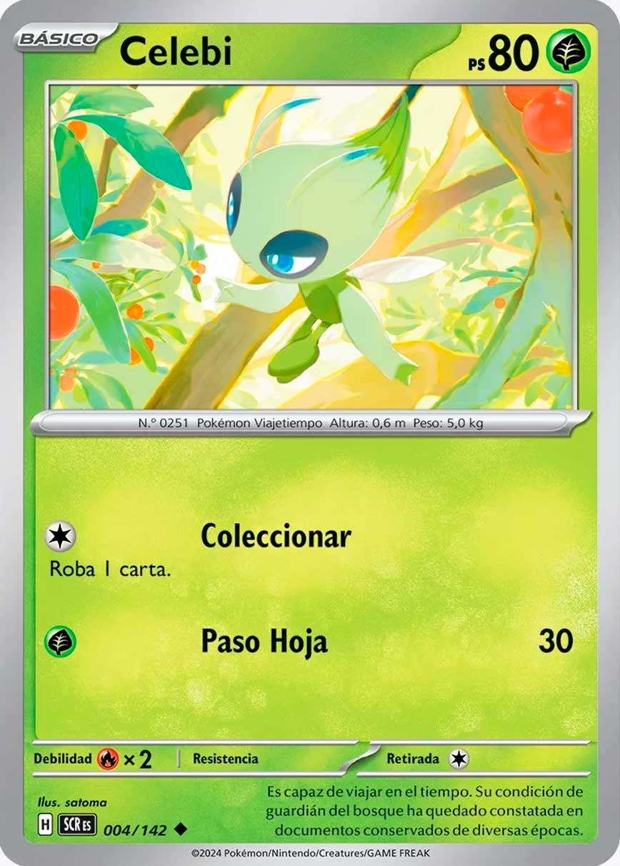 Entre las cartas reveladas, se encuentra Aroa, Brie, Celebi y las familias evolutivas de Applin, Toedscool, Gulpin, Impidimp, Terapagos ex y otros más.