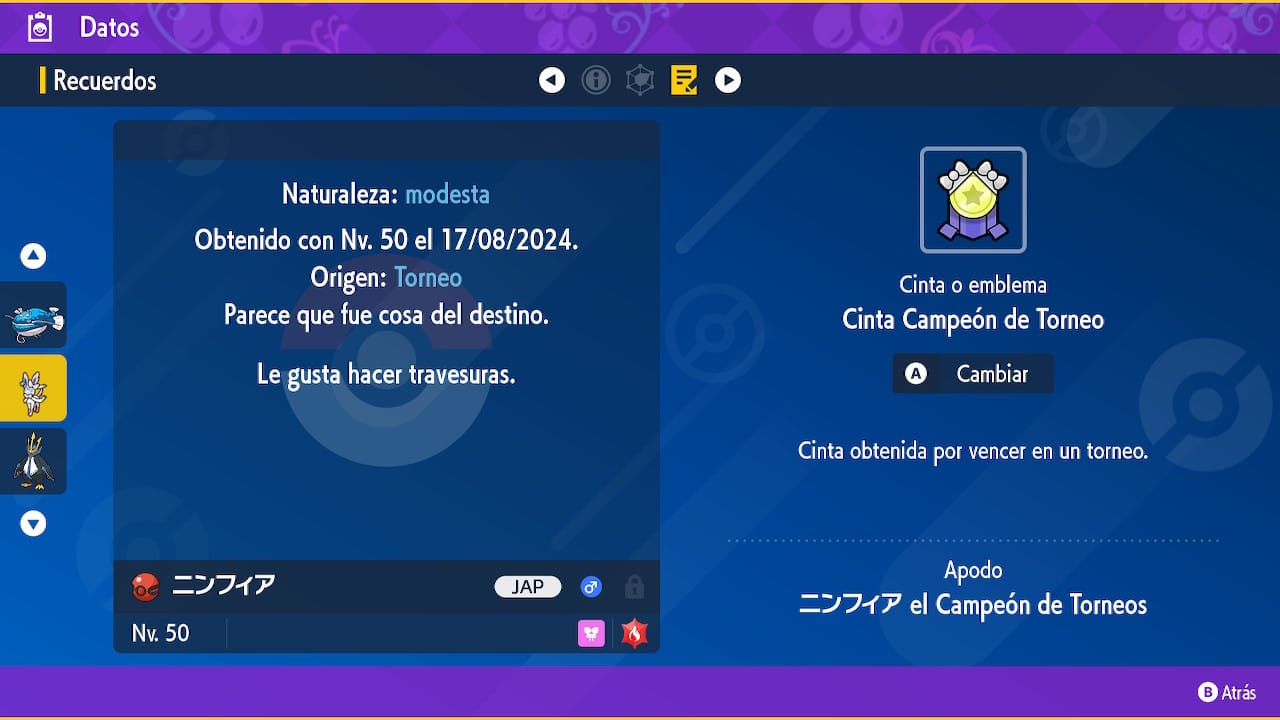 - Cinta: Cinta campeón de torneo (Battle Champion Ribbon) y Cinta Camarada (Partner Ribbon)