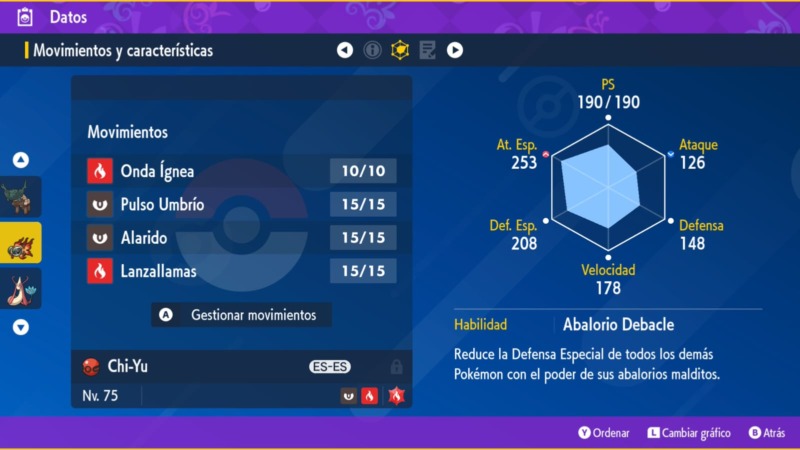 • Movimientos: Onda Ígnea (Heat Wave), Pulso Umbrío (Dark Pulse), Alarido (Snarl) y Lanzallamas (Flamethrower)