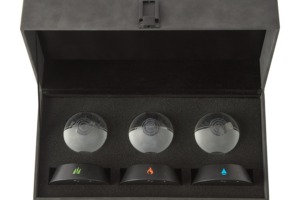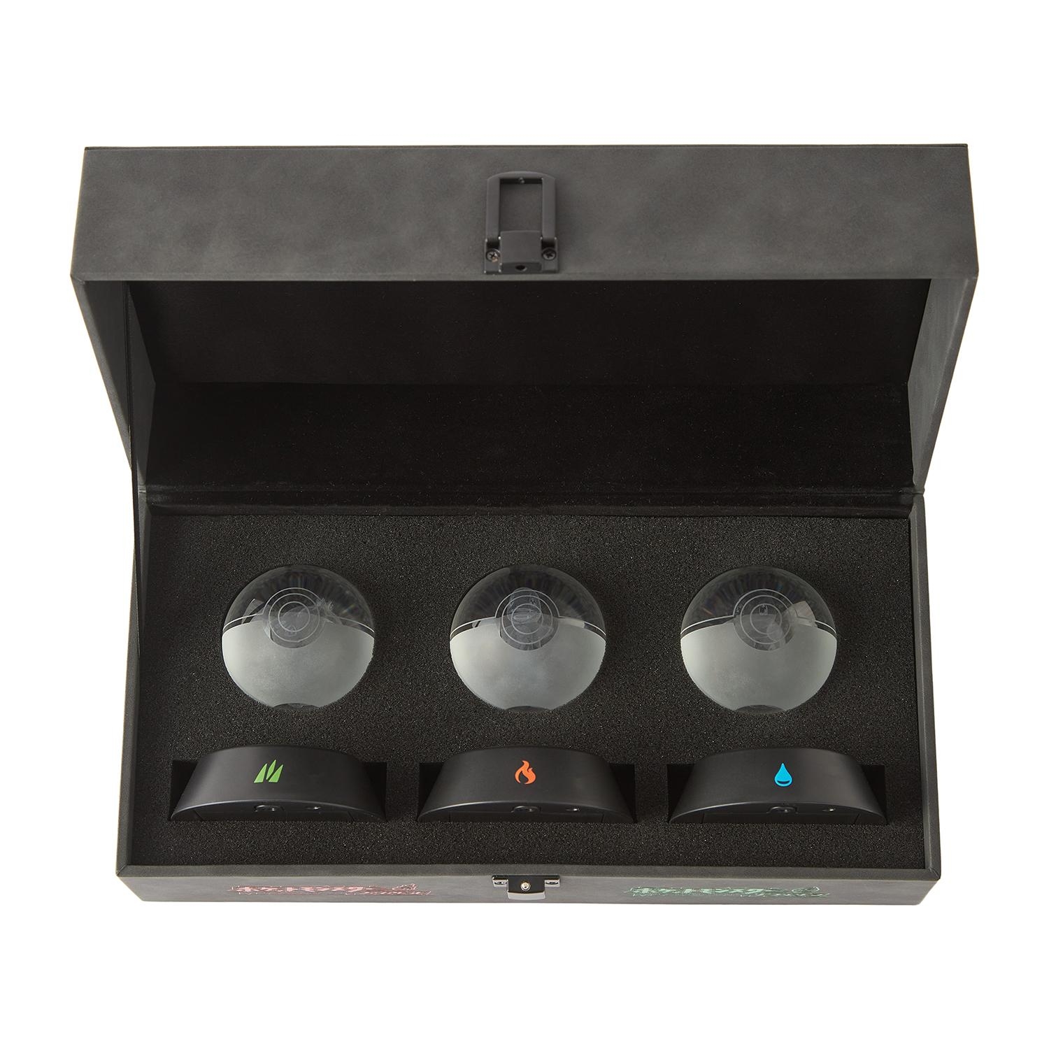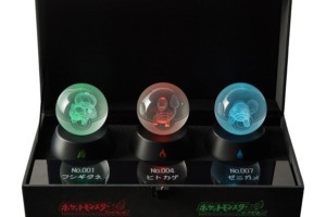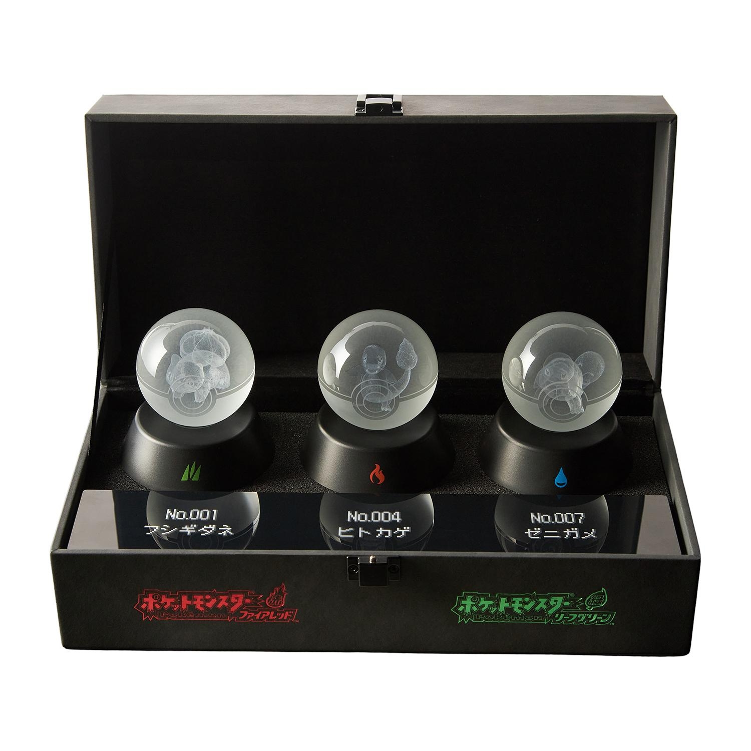 - Sets de Poké Balls de cristal: Tres esferas de cristal de alta calidad con Bulbasaur, Charmander y Squirtle grabados en 3D mediante láser en su interior.